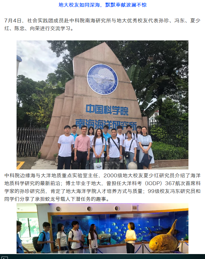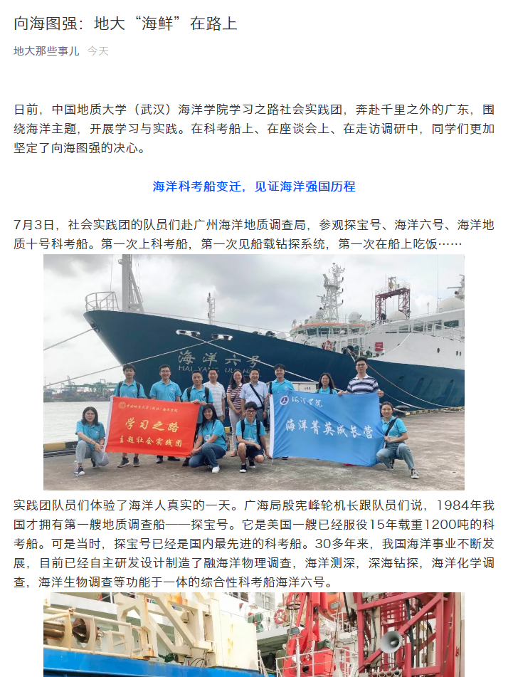 报道从“海洋科考船变迁,见证海洋强国历程”、“地大校友如同深海,默默奉献波澜不惊”、 “练就过硬专业本领,树立谋海济国之志”、“走进港珠澳大桥,找到奋斗的动力”四个专题部分对海洋学院“学海洋强国思想,践向海图强之路”的暑期社会实践活动进行详细的报道。