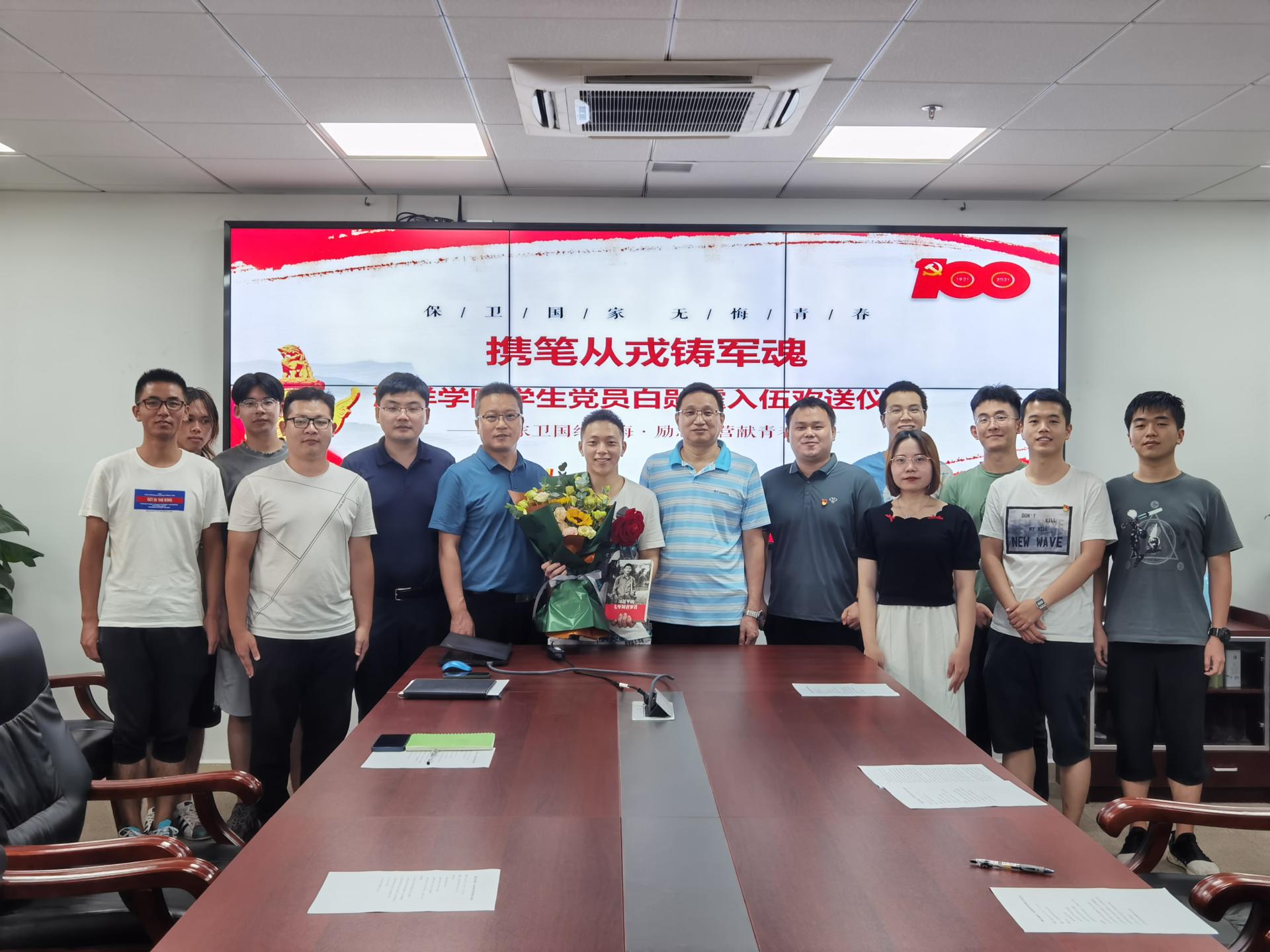 仪式最后,成军书记代表学院党委为入伍学生党员白勋霆赠送纪念品并合影留念。