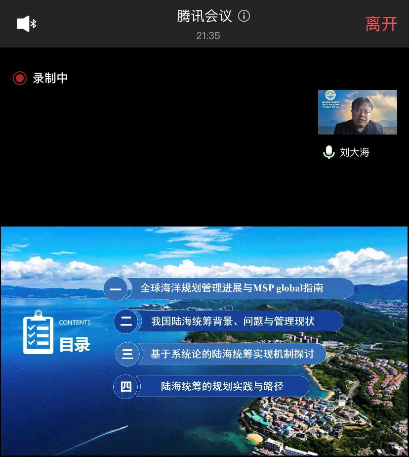 刘大海教授介绍了自然资源部的成立政策背景以及海洋在国土空间与自然资源改革中的定位。他从起、承、转三个方面介绍了陆海统筹发展的科学研判。