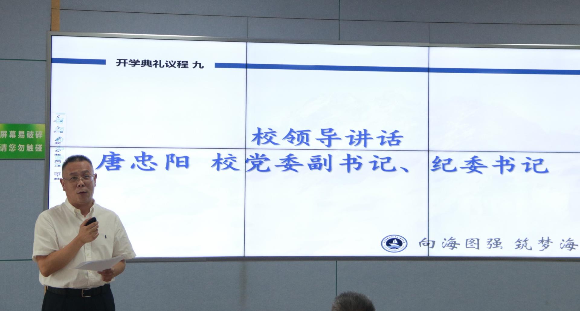 唐忠阳副书记做开学典礼总结讲话。他指出,我校海洋专业办学底蕴深厚,专业人才培养体系完善,自海洋学院建院以来取得了卓越的成绩,学校将继续高度重视海洋学科建设与发展,助力地大海洋学子成长成才。他表示,“海洋强国”战略需要大量的海洋人才,大家加入海洋学院正逢其时,并寄语广大同学要以“大航海”时代为课题,将小我融入大我,学知识强本领,投身“海洋强国”伟业中。