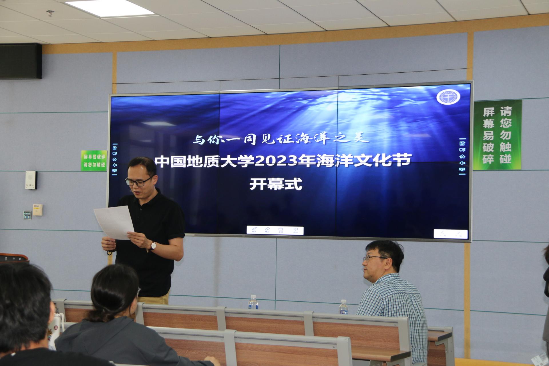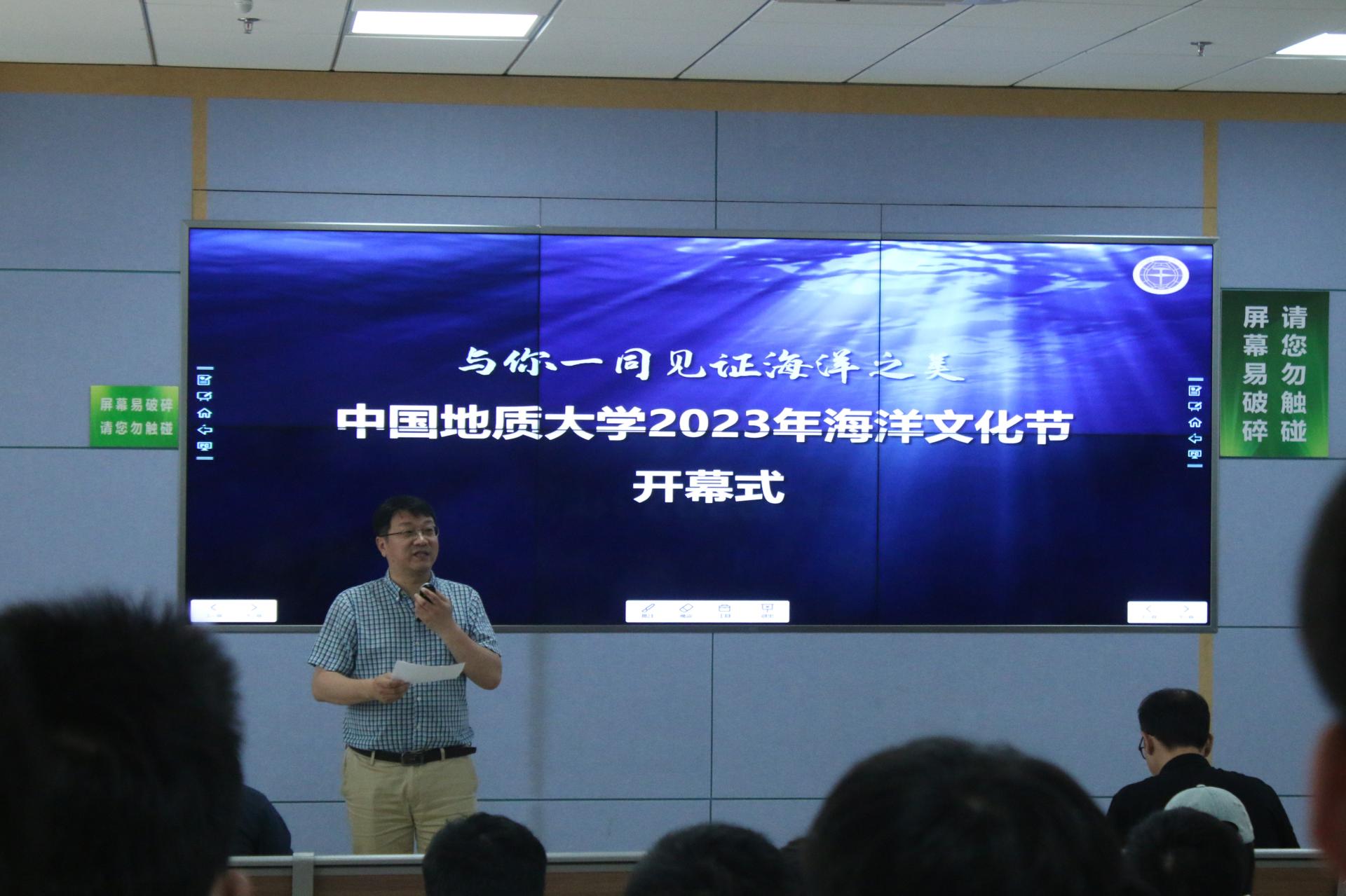 海洋学院副院长宫勋介绍开幕式讲座嘉宾。他表示,希望通过“科海扬帆,筑梦深蓝”海洋文化节系列科普讲座的开展,不断拉近师生与蔚蓝海洋的距离,共同提升我们保护海洋的意识。