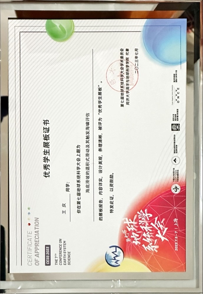 2023年7月5日至7日,为期3天的第七届地球系统科学大会在上海召开。我院博士生王庆以其出色的展板报告在564份学生展板中脱颖而出,荣获“优秀学生展板奖”,是中国地质大学(武汉)唯一获奖学生。他的报告题为“海底滑坡的退积式滑动及其触发海啸评估”,由孙启良教授指导。