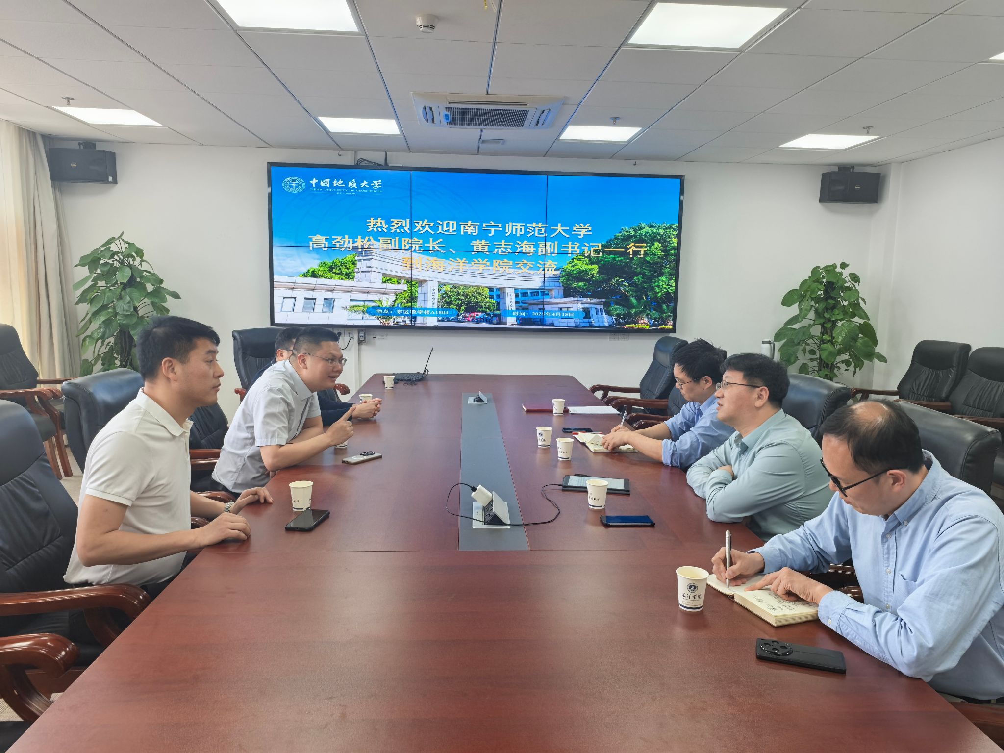 2025年4月15日,南宁师范大学高劲松副院长、黄志海副书记一行莅临学院进行座谈交流。海洋学院党委书记刘国华、院长孙军、副院长宫勋及团委书记陈波等参加交流,工程学院党委副书记高晓东陪同参会。