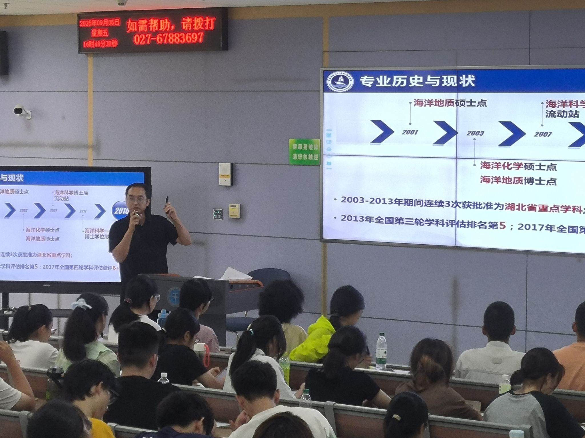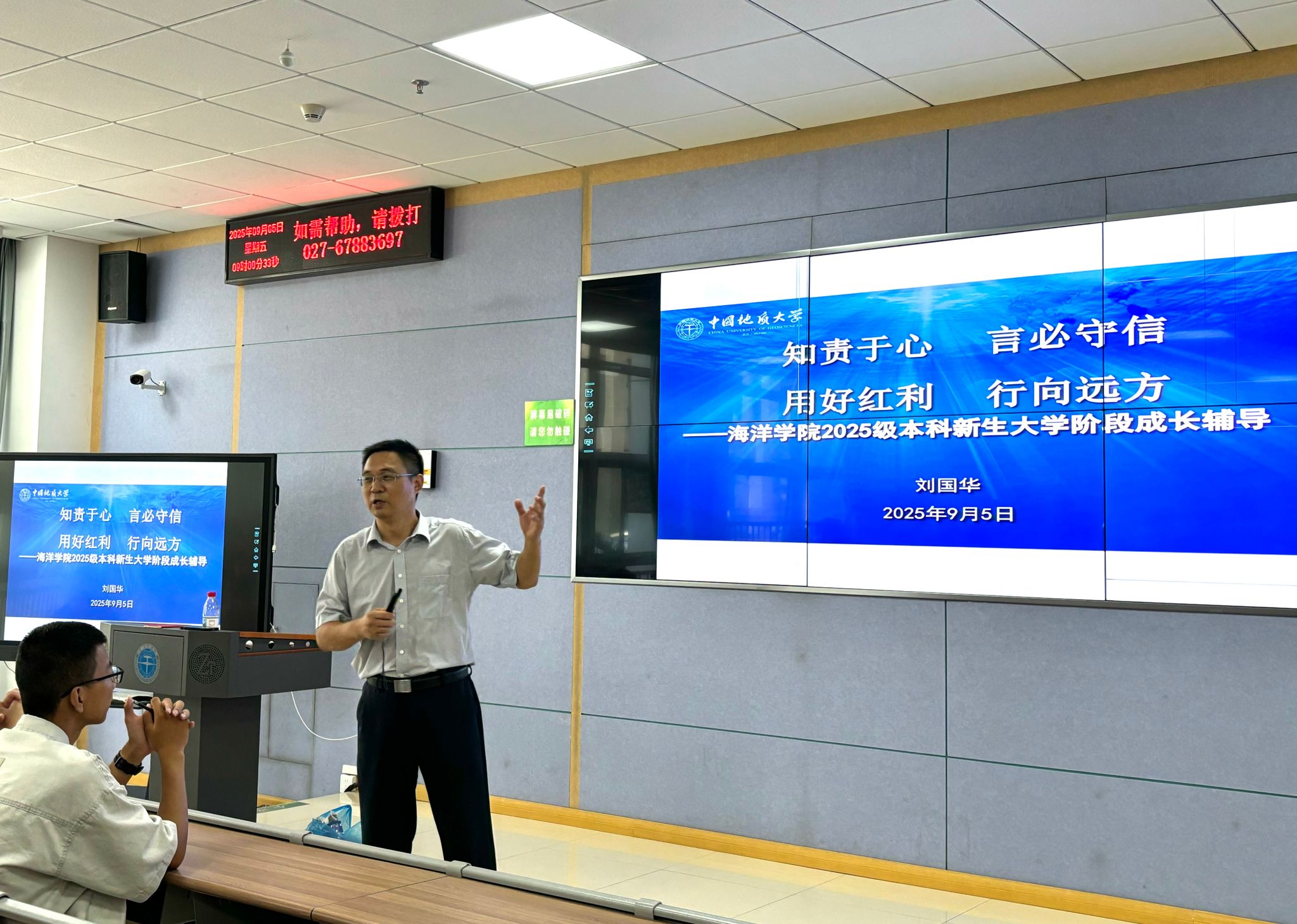 学院党委书记刘国华以《知责于心 言必守信 用好红利 行向远方》为题,提出他对新海洋学子在地大学习成长的期待,播放了纪念中国人民抗日战争暨世界反法西斯战争胜利80周年文艺晚会中的情境剧《永远的番号》、《勘探队员之歌》《周口店的那个夏天》《方向》等视频,带领同学们了解海洋学院的发展历程、学科专业与人才培养、科学研究与科研条件、重点研发团队、五大实习站点、升学和就业等内容并围绕党史、校史、院史、抗战精神等开展现场抢答活动。