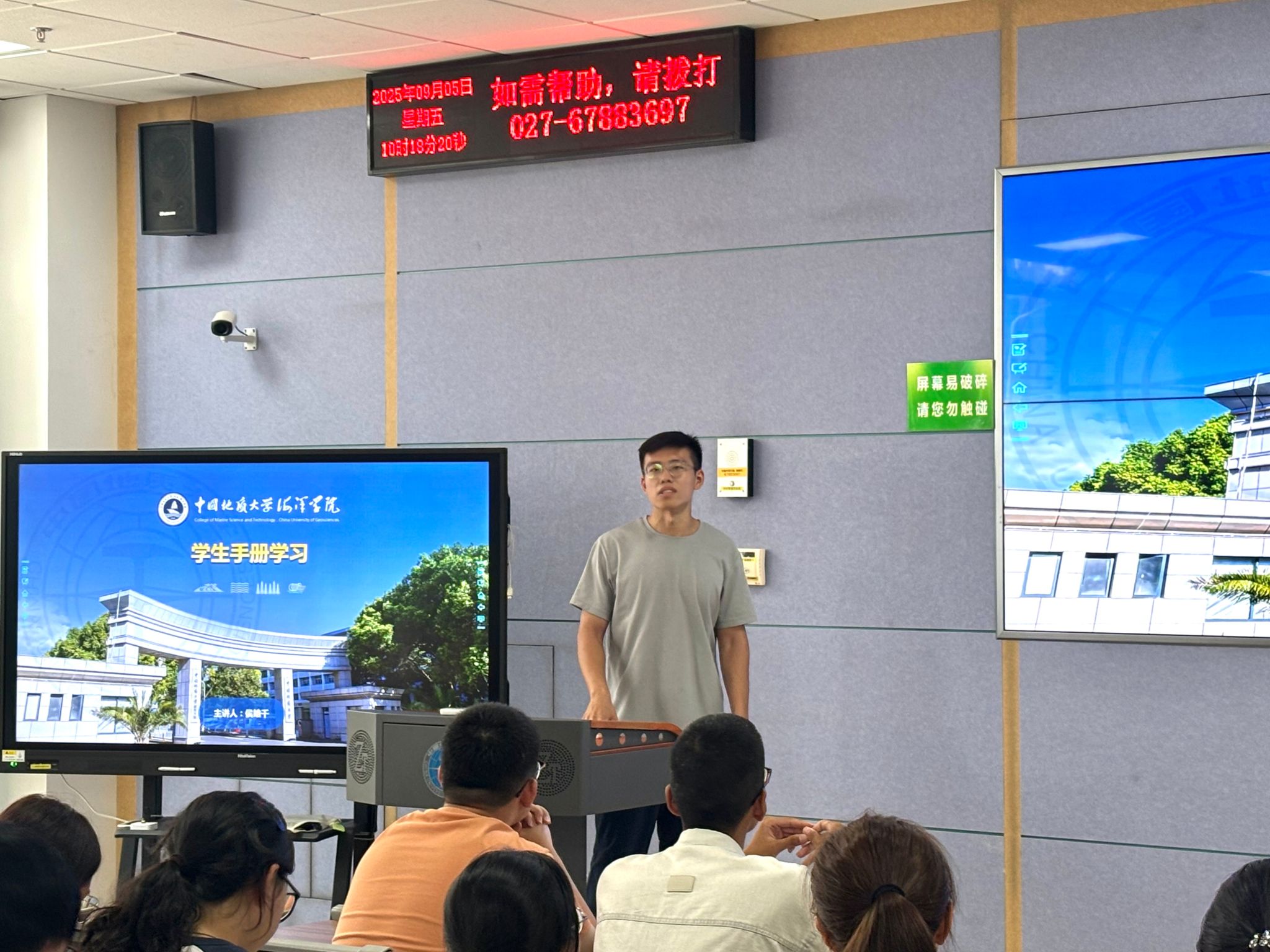兼职辅导员侯皓千从学生手册则着手,详细讲解了学校的规章制度、行为规范、奖助政策、学业要求等,帮助新生们知晓何为可为、何为不可为,为未来四年规范、有序、高效的学习生活提供了清晰的行动准则。