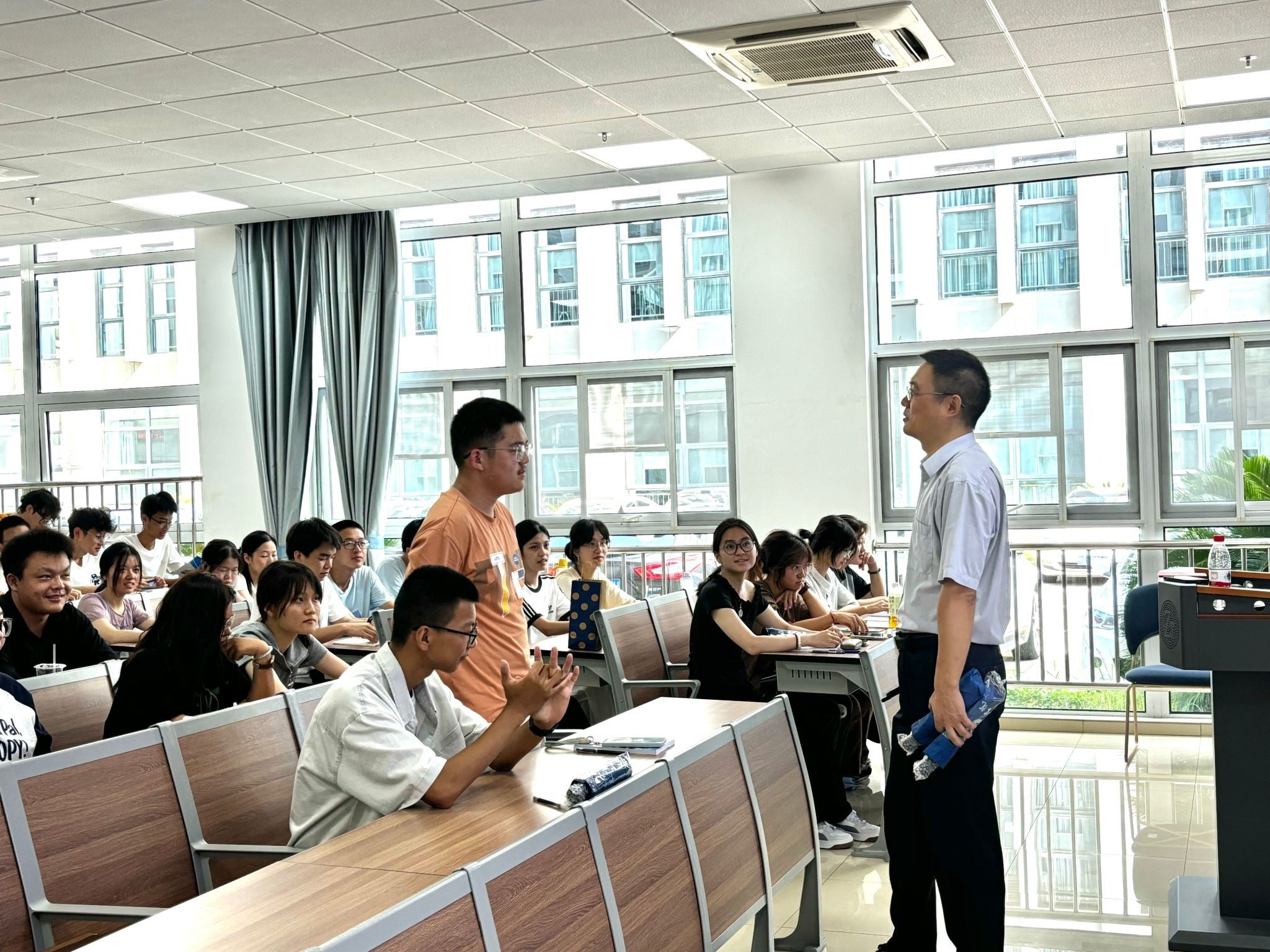 学院老师为同学们讲解海洋学院的专业设置和发展方向和就业的专题内容。郑彦鹏教授“海洋发展机遇与挑战”课程高屋建瓴,从国家“海洋强国”战略的高度,阐述了海洋领域在经济发展、科技创新、国家安全等方面的极端重要性,分析了当前面临的机遇与挑战。接着刘恩涛教授与匡洋民副教授进行海洋学院专业介绍与培养方案解读,细致剖析了各专业的培养目标、课程体系、实践环节、发展方向及就业前景,为尚在迷茫中的新生拨开迷雾,帮助他们基于兴趣和未来规划,更理性地思考并初步确立专业学习方向。