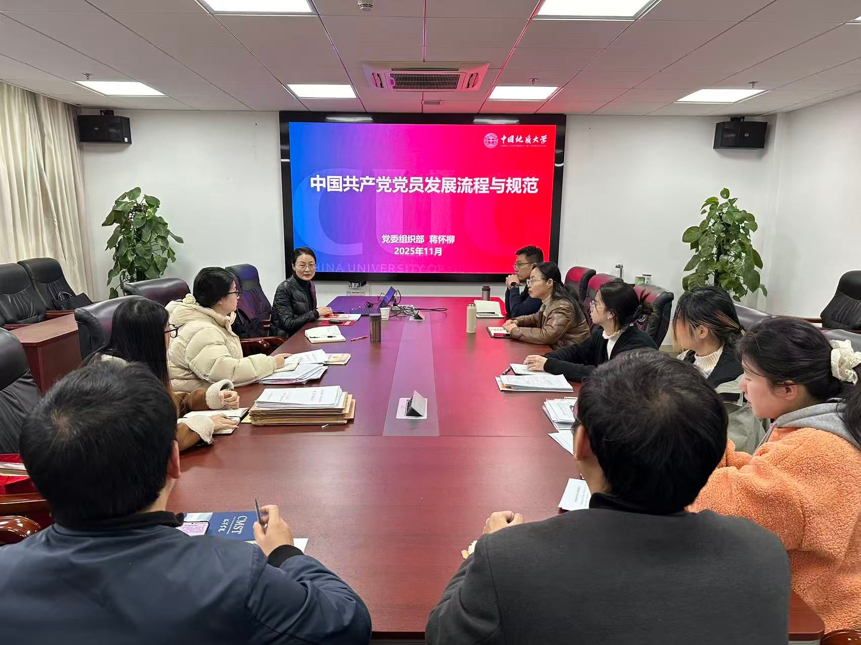 为进一步规范发展党员工作流程,提升党务工作者业务能力,严把党员“入口关”,2025年12月10日,海洋学院举行党务工作讨论会。党委组织部正处级专职组织员蒋怀柳到学院指导工作。学院党委书记刘国华、党委副书记钟苹、团委书记陈波、组织秘书韩瑞以及学院各师生党支部书记参会学习。