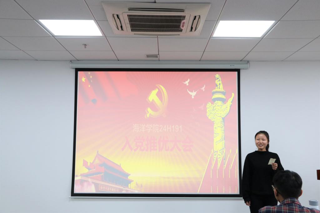 (通讯员:王锦怡)2019年10月26日下午,海洋学院24H191班团支部于东教A1805举行入党推优大会。本次大会由班长吴天婷主持,本科生党支部书记黄开旗同志出席会议,大会应到30人,实到26人,4人请假。