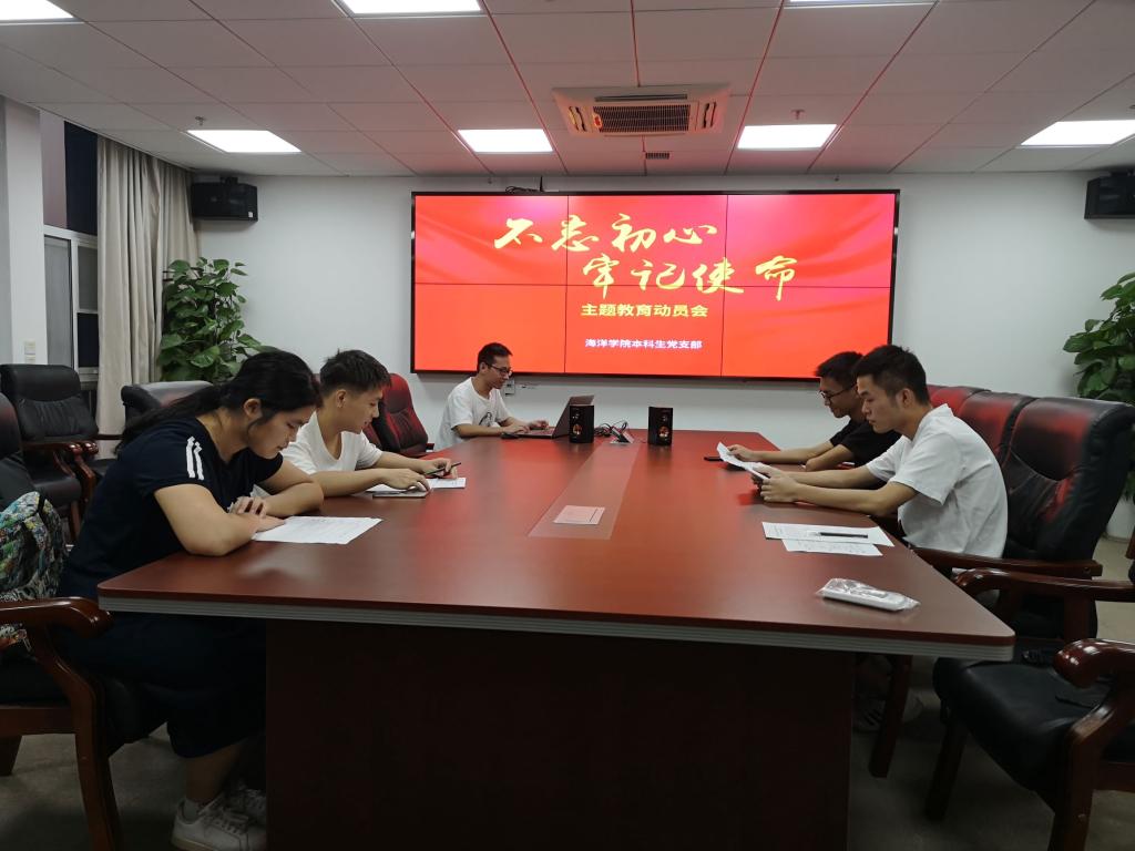(通讯员:刘辉)2019年9月26日下午16:30,海洋学院本科生党支部于东教楼A1804开展“不忘初心,牢记使命”主题教育动员会和“我和我的祖国”主题党日活动,本次活动由支部书记黄开旗主持,除部分同志请假外,其余全体参加,会议时长一个半小时。