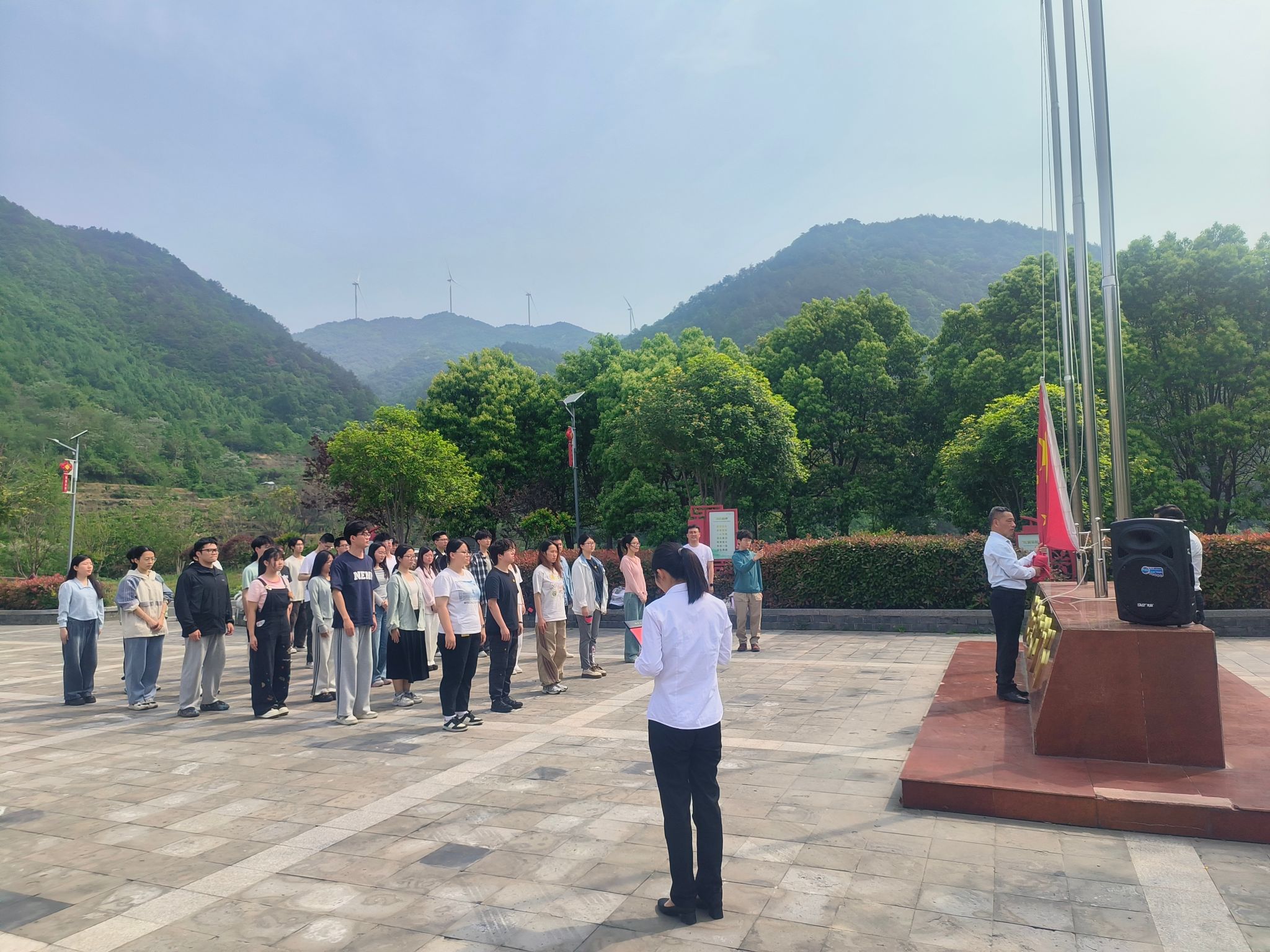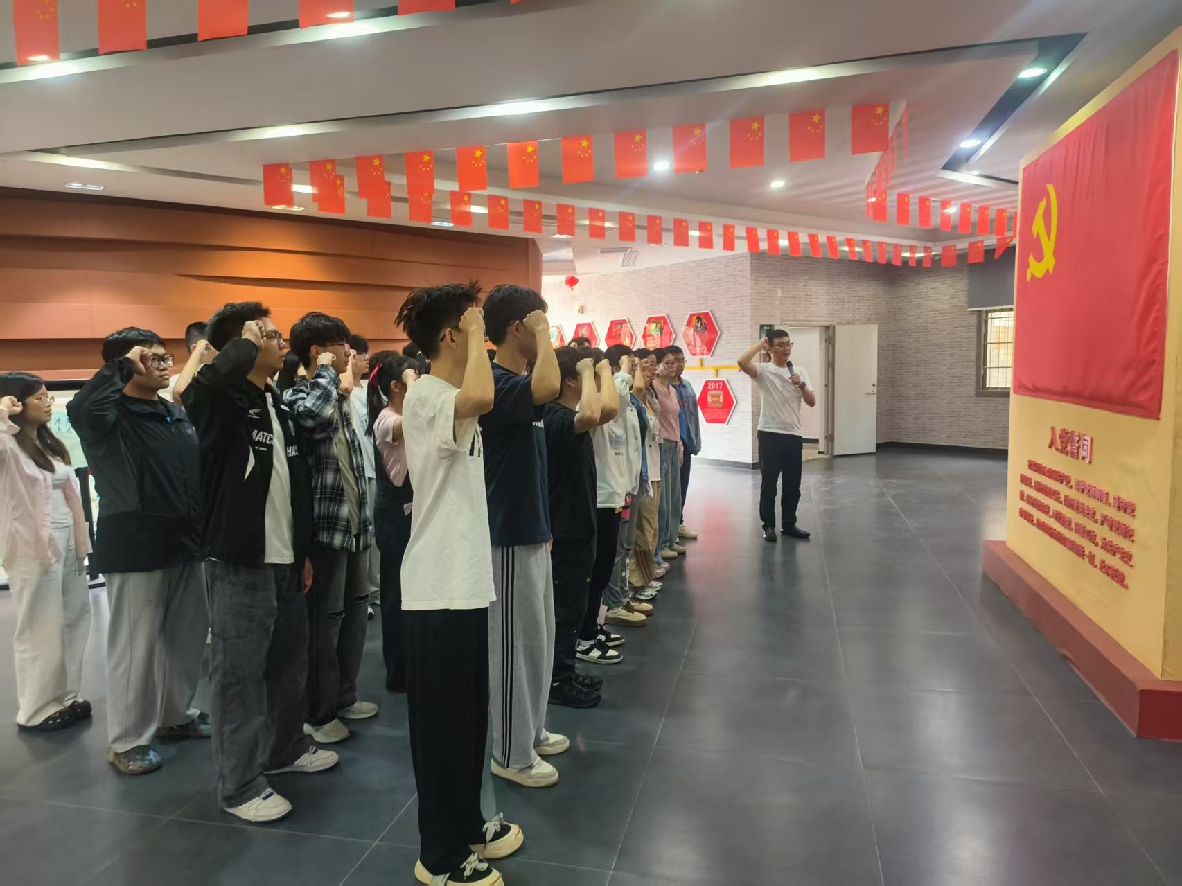 上午8时,同学们在东区化石林集合,乘坐大巴前往姚家山。作为抗日战争的重要根据地,姚家山素有“武汉抗战第一村”之称。抵达后,全体成员参加了庄严的升旗仪式,并在陈列馆前合影留念。随后,同学们向烈士敬献花篮,重温入党誓词,表达对革命先烈的深切缅怀与崇高敬意。