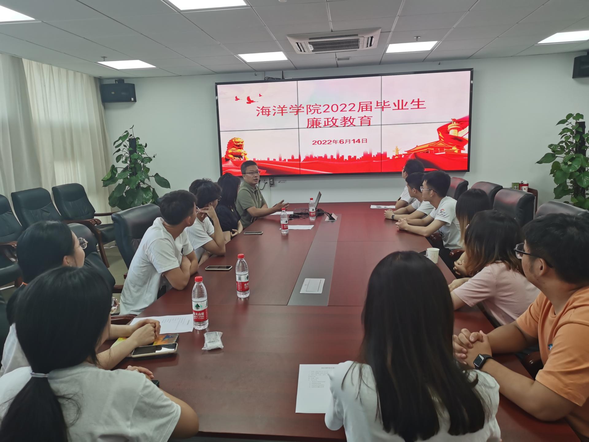 (通讯 罗兴碧 陈波)2022年6月14日下午,海洋学院在东教楼A1804会议室开展2022届毕业生座谈会暨毕业党员廉政教育党课。党委书记成军,副院长姜涛、孙启良,雷超、蒋浩宇、陈波老师出席会议,钟苹副书记主持会议。海洋学院三十余名毕业生到场交流和学习。