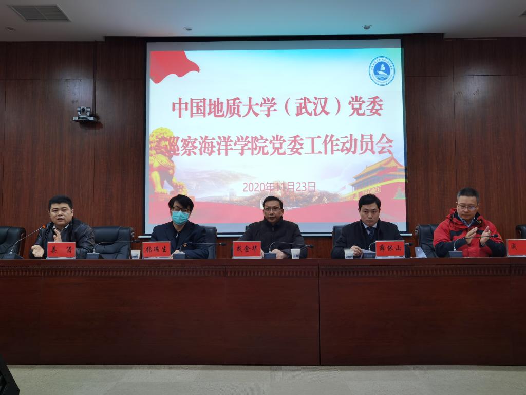 2020年11月23日,中国地质大学(武汉)党委巡察海洋学院党委工作动员会在南望山校区东区教学综合楼A-708会议室召开。学校党委副书记成金华出席会议,学校党委第三巡察组组长薛保山、副组长张瑞生和成员陈汉英、张京、严森,学院全体教职工、学生代表等五十余人参加会议。副院长姜涛主持会议。