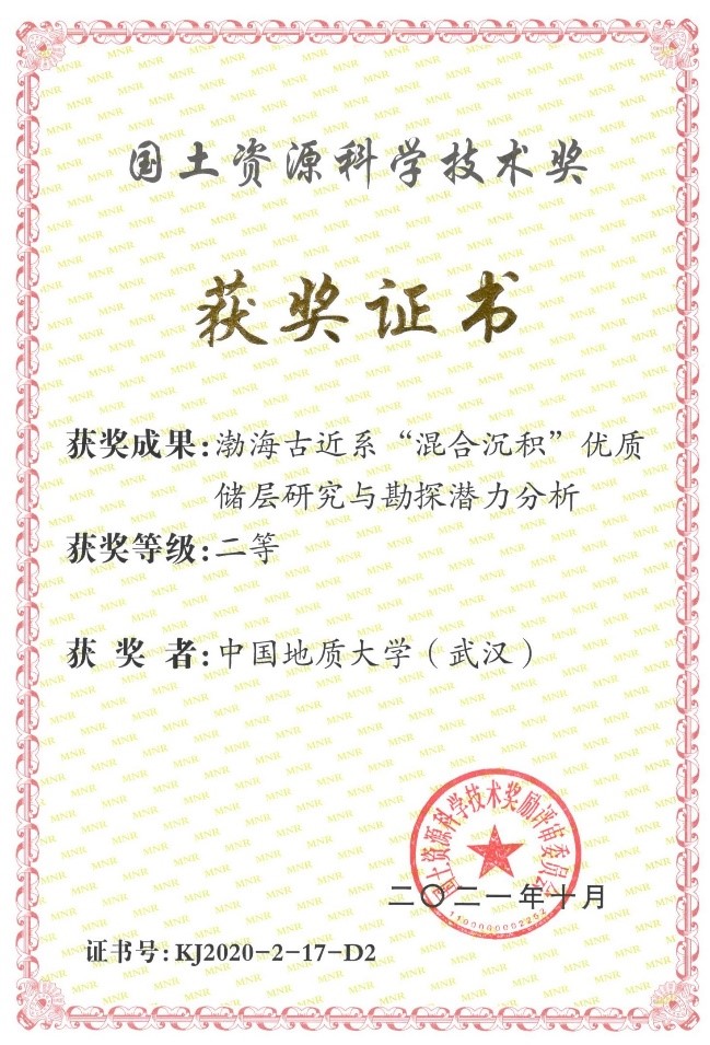 2021年10月,2020年国土资源科学技术奖评选结果公布,我校与中海石油(中国)有限公司天津分公司联合申报的《渤海古近系“混合沉积”优质储层研究与勘探潜力分析》获得二等奖,其中中国地质大学(武汉)为第二完成单位,海洋学院解习农教授为第二完成人、杜学斌副教授为第七完成人。此次获奖成果71项,其中一等奖11项,二等奖60项。