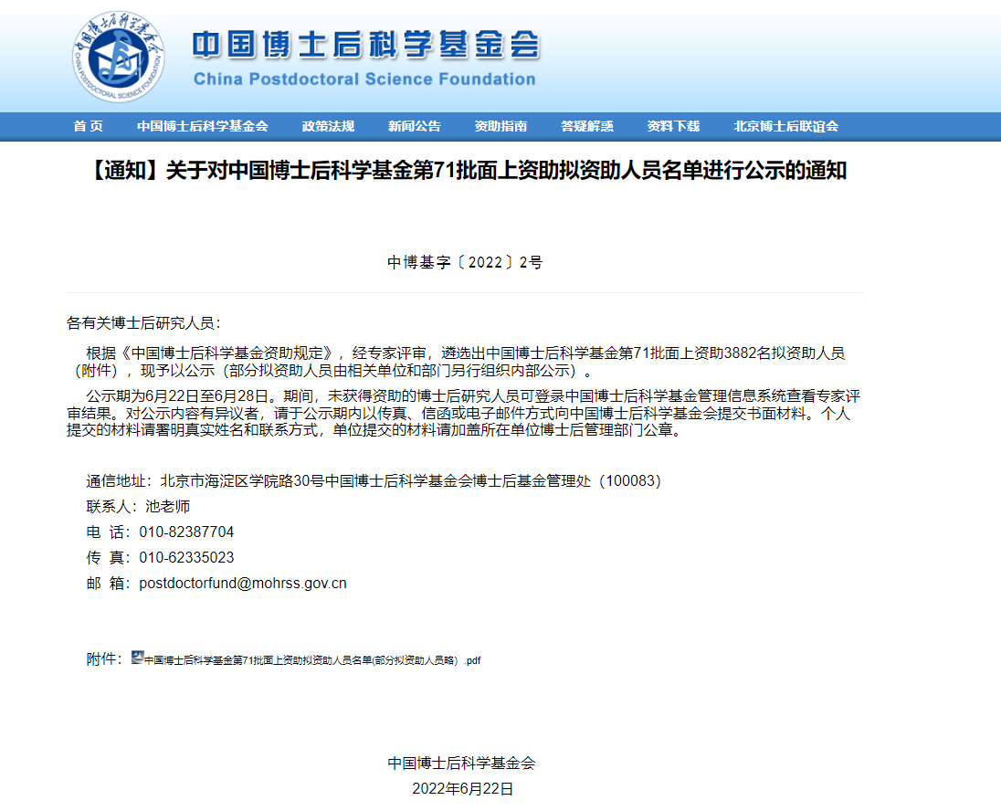 通知链接:【通知】关于对中国博士后科学基金第71批面上资助拟资助人员名单进行公示的通知 (chinapostdoctor.org.cn)