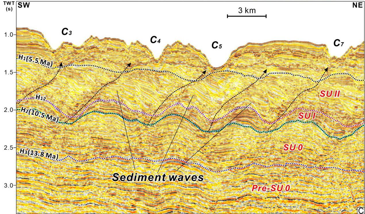1 南海北部神狐海域垂直峡谷群地震剖面,可见沉积物波及峡谷迁移
