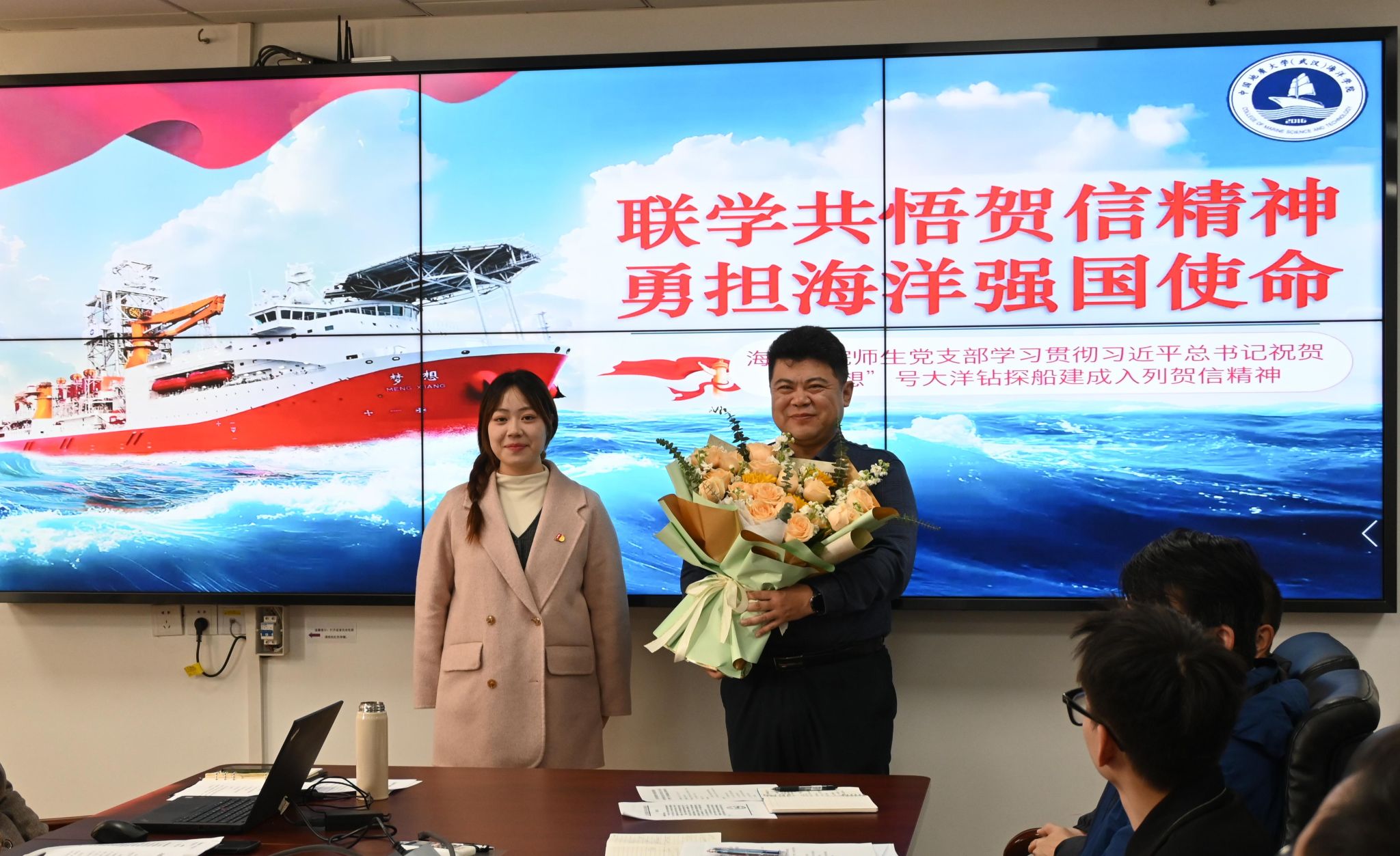 为深入学习贯彻习近平总书记致“梦想”号大洋钻探船建成入列贺信精神,学习自然资源部中国地质调查局致我校感谢信内容,11月29日上午,海洋学院召开党委理论中心组扩大会议组织专题学习。党委理论中心组成员、教师党员代表、“山海求知”党支部支部委员及部分学生代表共同参会。
