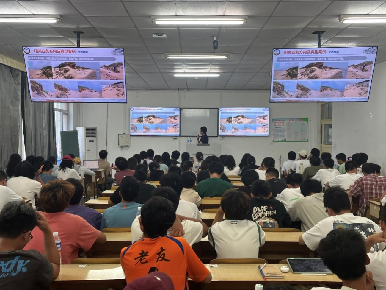 二是教学手段丰富。针对各实习路线和相关的地质现象与知识点,教师们精心准备了展板,以便学生更直观地掌握相关教学内容。实习期间,河北省海洋地质资源调查中心张甲波总工程师和我院王家生教授应邀为我院师生做专题报告,进一步深化和拓展了野外教学内容。河北省海洋地质资源调查中心王琰高级工程师在浅水湾浴场现场为我院师生介绍海岸带修复技术及效果。