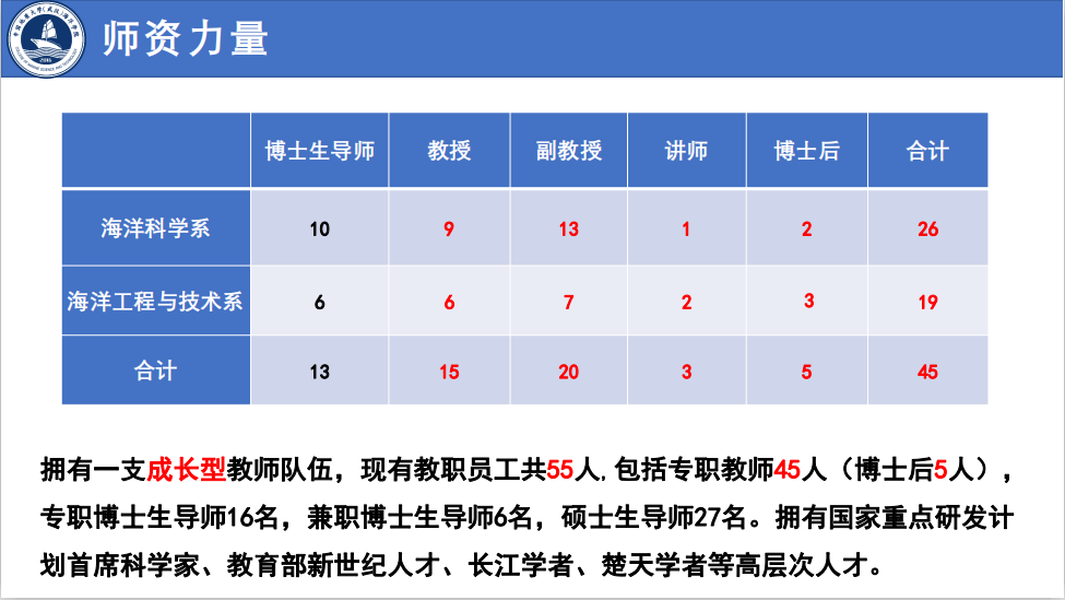 海洋学院始源于20世纪50年代学校组建的海洋地球物理勘探教研室,成立于2016年,现有海洋科学湖北省重点学科1个,海洋科学博士后科研流动站1个,海洋科学一级学科博士学位授予权1个,海洋科学一级学科硕士学位授予权1个,地质工程专业学位授予权1个,拥有“本科-硕士-博士”完整人才培养体系。学院现有教职工55人,其中教授15人、副教授22人、讲师3人,拥有国家重点研发计划首席科学家等高层次人才。