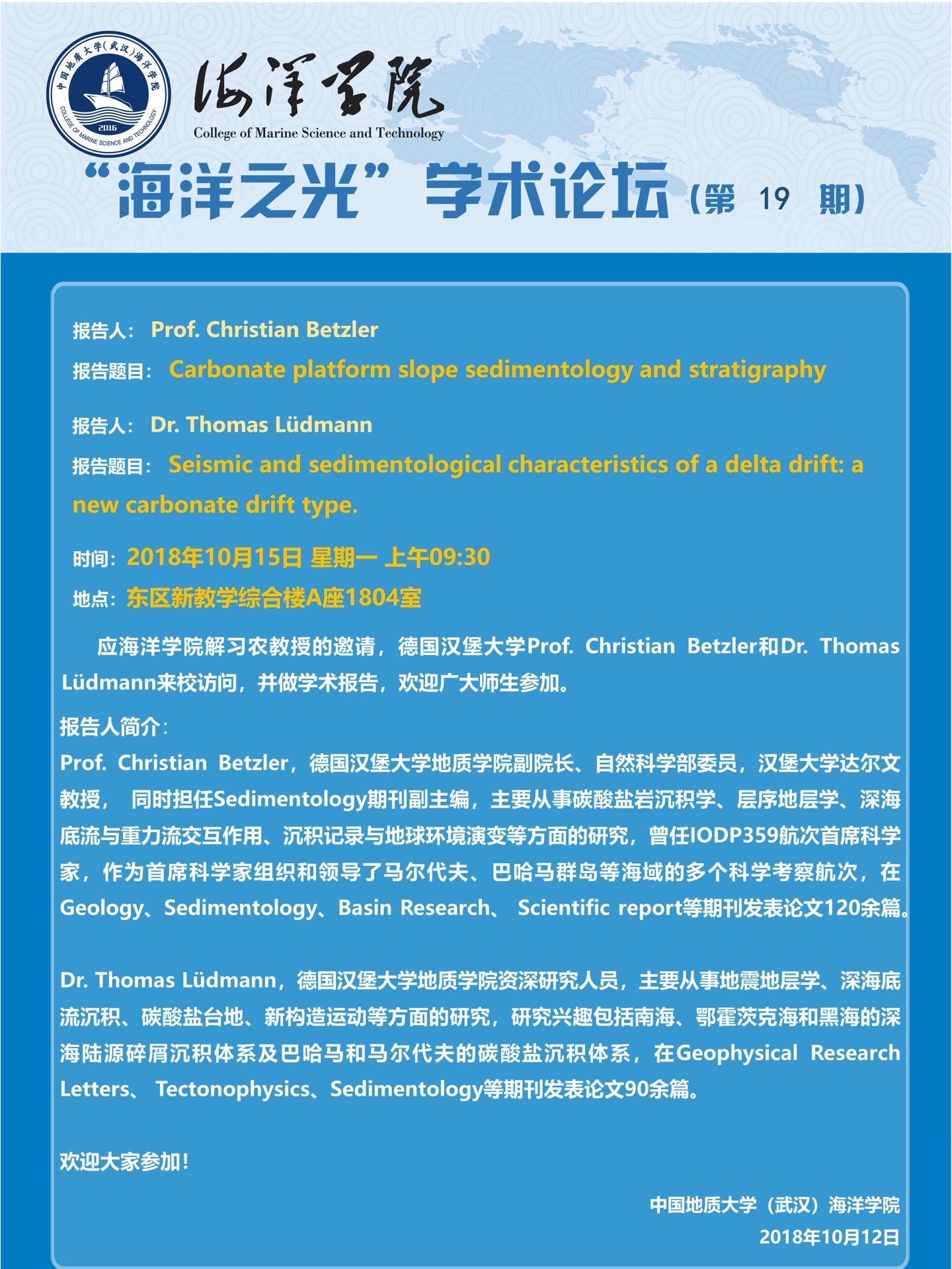 “海洋之光”学术论坛(第19期)—— Prof. Christian Betzler and Dr. Thomas Lüdmann