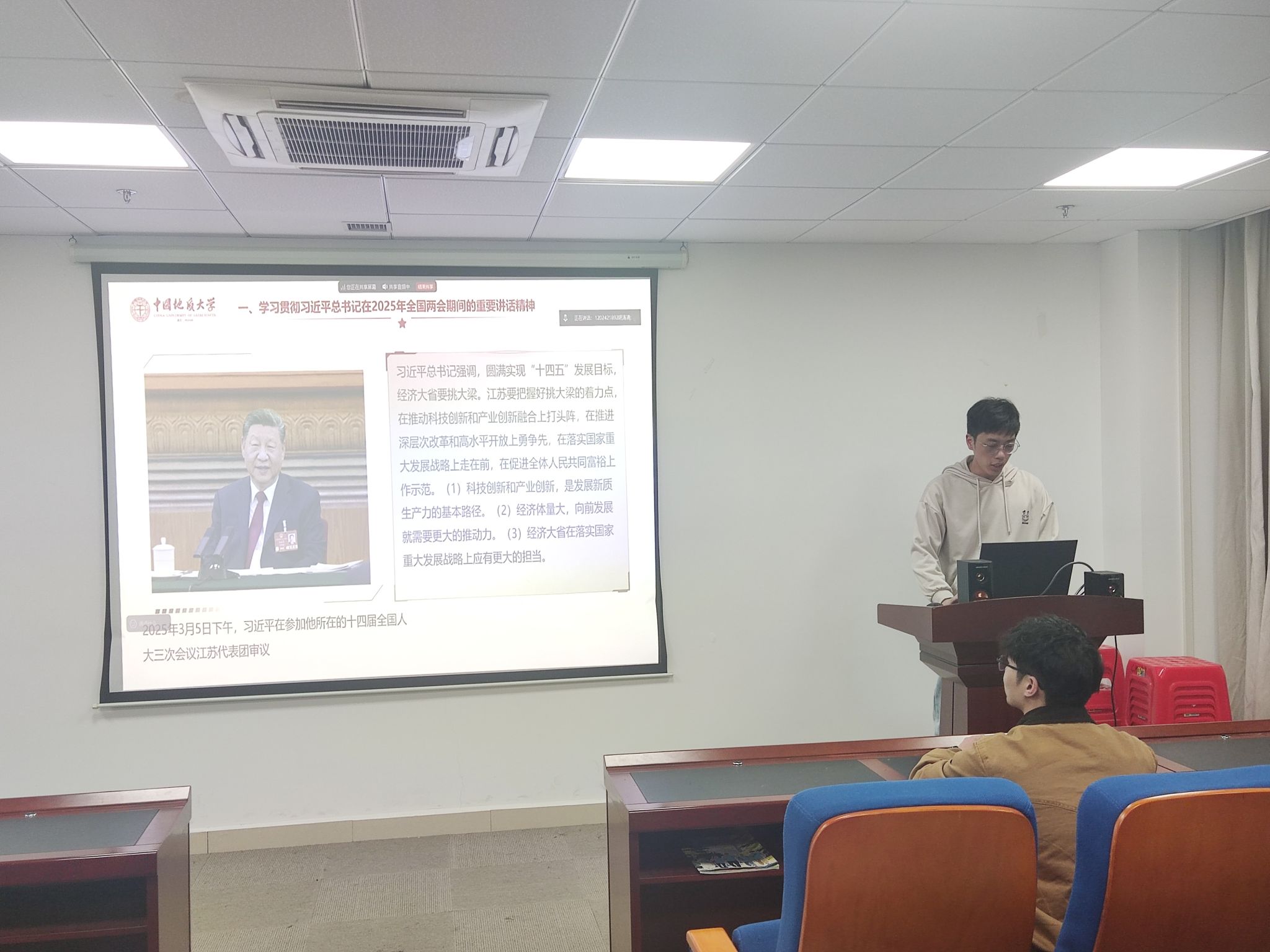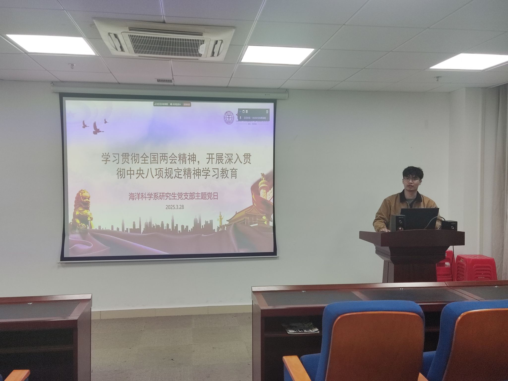 为了学习习近平总书记重要讲话和2025年全国两会精神,202532719时,海洋学院“山海求知”党支部在东区教学楼A1804会议室开展三月主题党日专题学习活动。由曾范鑫同志主持,焦洋硕同志主讲。