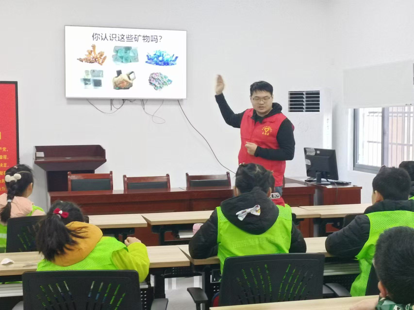 团队依托地质学科专业优势,精心打造"古生物化石探秘"与"宝石矿物认知"和“科学家精神宣讲”主题课程。在"古生物化石探秘"课堂上,三叶虫、恐龙等古生物标本配合动态复原图,生动演绎地球46亿年的生命演化史;在"宝石矿物认知"环节中,孩子们通过亲手触摸、晶体观察等趣味实验,亲手触摸黄铁矿、水晶等矿物标本,理解"宝石与矿石"的地质奥秘;在“科学家精神宣讲”课堂上,孩子们聆听地质科学家的故事,以前辈为榜样。