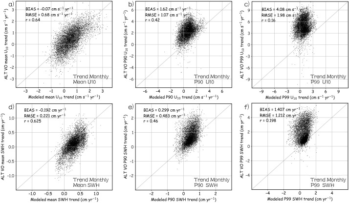 Fig. 7. Comparison between the trends of U10 (a–c) and SWH (d–f) from monthly statistics over the period 1985–2018 derived from ERA5 and VO. The left, middle, and right columns correspond to the comparisons of trends of means, 90th percentiles, and 99th percentiles, respectively.