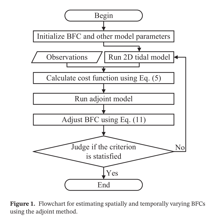 底摩擦系数是精确模拟水动力环境和悬沙输运的关键,对科学研究和沿海海洋工程具有重要意义。众多现场观测表明,底摩擦系数是时空变化的,但在传统潮汐模型中很难精准给定时空变化的底摩擦系数。本研究基于一个二维多分潮潮汐伴随同化模型,同化TOPEX/Poseidon卫星高度计所得渤黄东海M2、S2、K1和O1四个主要分潮的调和常数数据,优化估计了该海域时空变化的底摩擦系数。利用独立的验潮站观测数据对模型性能进行了评估,结果表明:同化后各分潮模拟精度显著提高。一系列敏感性实验结果表明:时间平均后的底摩擦系数空间分布特征是稳健的,不受模型设置的影响;空间平均后的底摩擦系数时间变化特征也是稳健的,但与分潮的选择有关。此外,优化反演所得时空变化底摩擦系数随流速和水深的变化与该海域观测趋势一致。总体而言,优化反演所得时空变化底摩擦系数与流速、水深密切相关,这归因于不同流速环境下海床泥沙的侵蚀沉积过程和海底粗糙度的变化。本研究为底摩擦效应参数化和多分潮潮汐模型中底摩擦系数的合理设置提供了一定的参考。