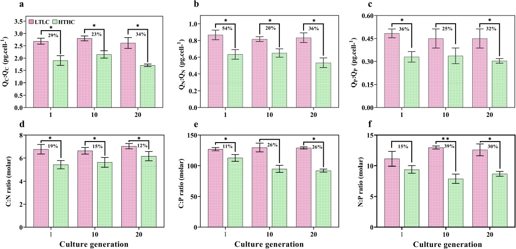 图1不同代赤藻在LTLC和HTHC条件下的元素和化学计量学变化。
