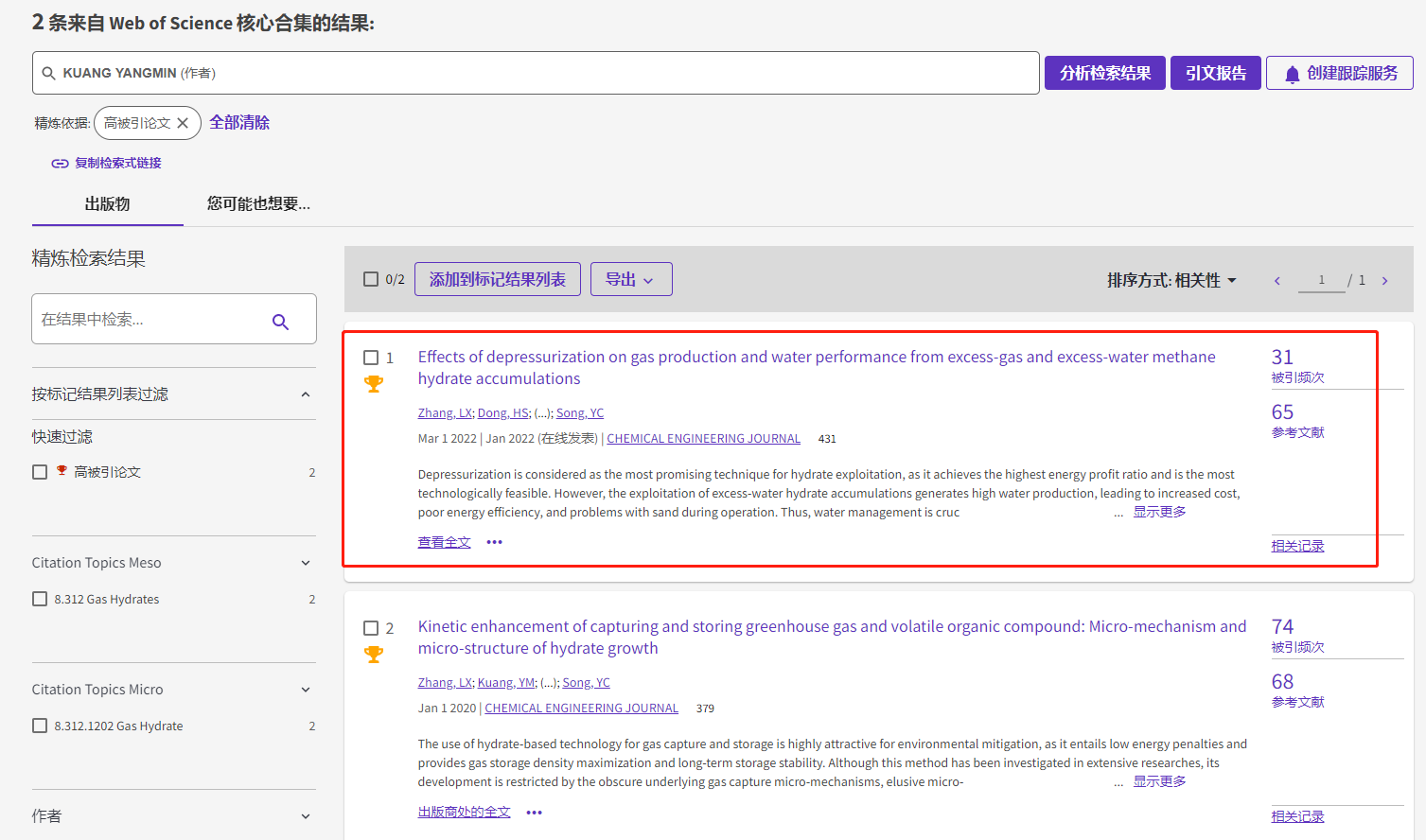 根据基本科学指标数据库(Essential Science Indicators,简称ESI)最新数据显示,我院匡洋民副教授作为通讯作者2022年在国际化学工程顶级期刊《Chemical Engineering Journal》(IF=16.744)上发表的学术论文《Effects of depressurization on gas production and water performance from excess-gas and excess-water methane hydrate accumulations》入选ESI高被引论文(Highly Cited Paper)。