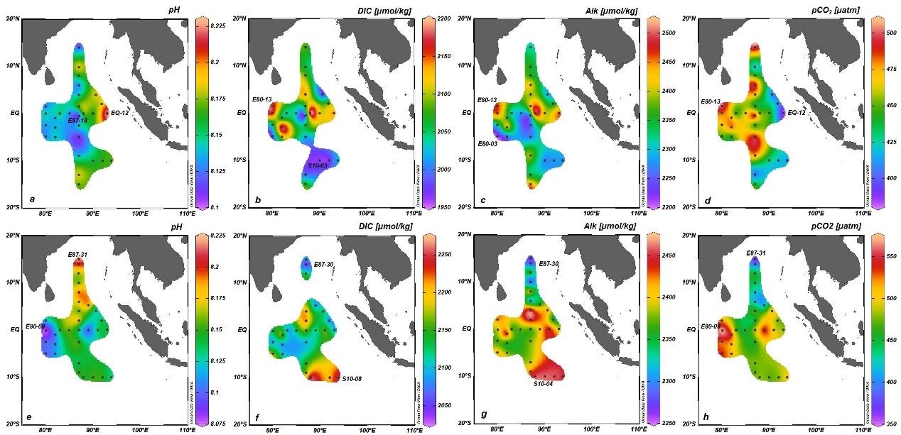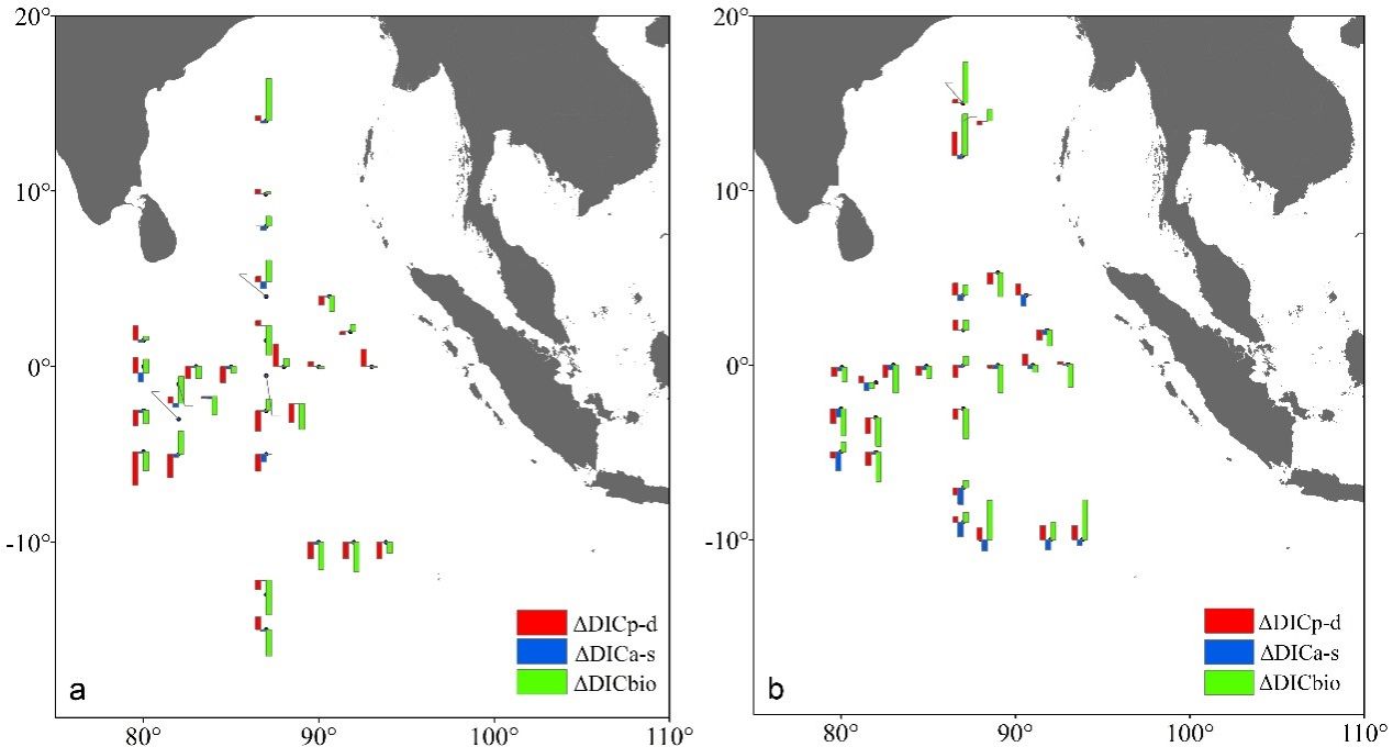 本研究报道了2020年秋季和2021年春季东印度洋(EIO)的pH、溶解无机碳(DIC)、碱度(Alk)和二氧化碳分压(pCO2)的时空分布,并进一步定量区分了不同控制过程对表层DIC的贡献。总体而言,在研究区域观察到碳酸盐体系参数的显著季节性变化。与2020年秋季相比,2021年春季表层的pH较低,DIC、Alk和pCO2较高。两个季节碳酸盐体系参数与不同粒径的叶绿素和不同类型的营养盐的相关关系也表明了浮游植物群落的变化和浮游植物利用的营养盐的变化主导了碳酸盐体系的变化。