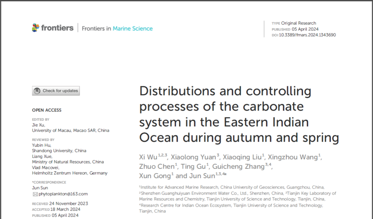 2024年4月5日,海洋学国际期刊《Frontiers in Marine Science》以 “Distributions and controlling processes of the carbonate system in the Eastern Indian Ocean during autumn and spring” 为题在线发表了我院孙军教授团队的研究成果。