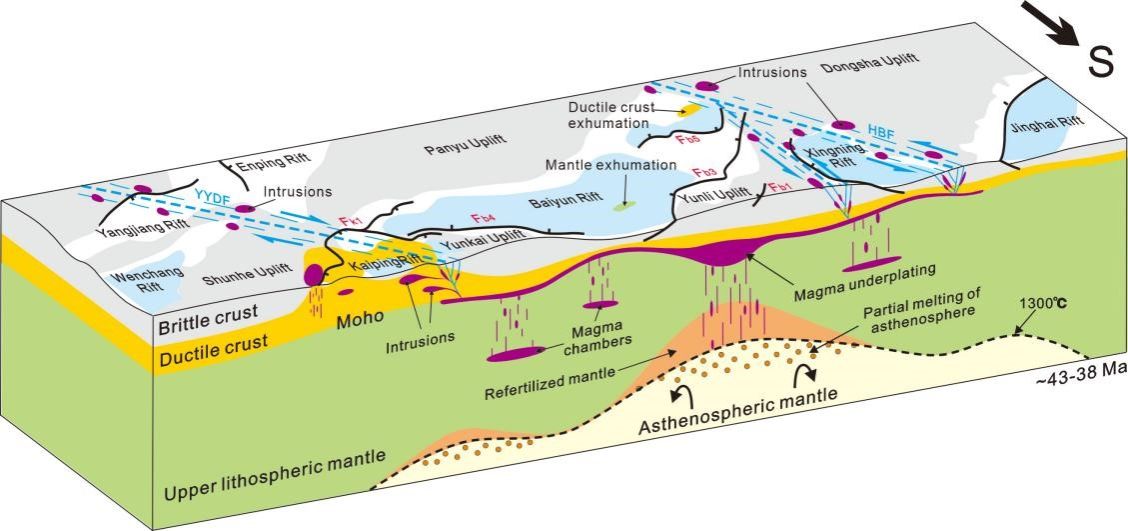 本研究识别、追踪了开平-白云凹陷不同类型的变质核杂岩构造,对其进行了类型划分,揭示了其时空分布规律。通过沉降史模拟,发现地壳核杂岩的发育往往会限制盆地的垂向沉降,造成区域上的差异沉降现象。此外,岩浆底侵和先存断裂的分布规律表明,裂陷期底侵岩浆或可能沿先存断裂侵入地壳内部,使得下地壳温度升高,黏度降低,导致地壳热状态的不均衡分布,从而造成在同样构造应力下存发育不同伸展构造样式。南海北部陆缘变质核杂岩构造的发育也表明该区域具有高温陆缘背景特征,或可能与经历了强烈的中生代造山运动后,岩石圈尚未达到热力学平衡状态有关。
