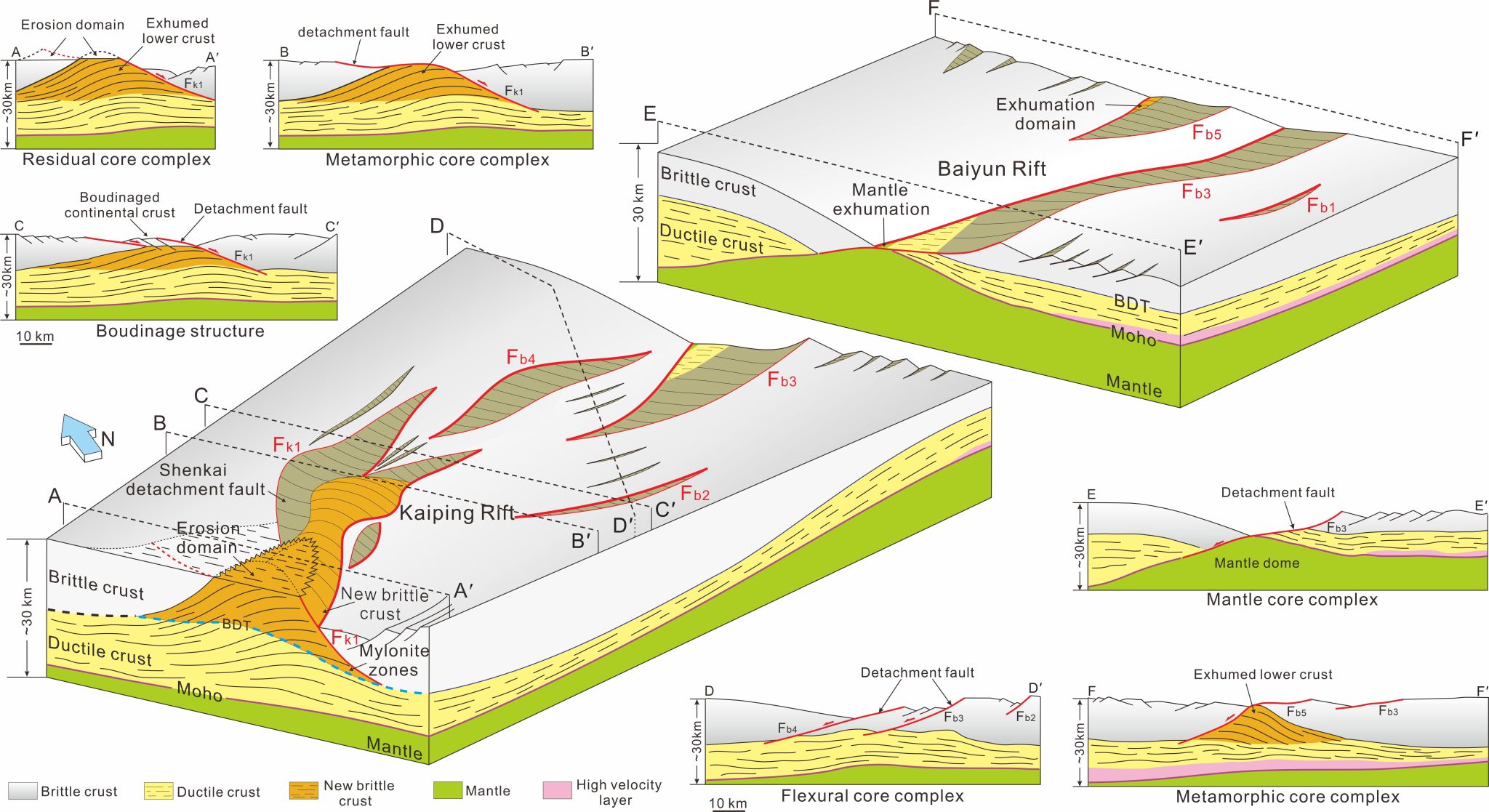 开平-白云凹陷位于南海北部陆缘珠江口盆地西南部,沿走向方向该区域地壳厚度与结构具有显著差异。本研究运用覆盖整个开平-白云凹陷的高分辨率3D地震资料,发现在新生代拉张作用下,下地壳流变学行为存在显著差异,在白云凹陷东部和开平凹陷韧性下地壳被拆离断层剥露上拱,形成典型的地壳核杂岩构造,而在白云凹陷中部则是地幔物质被拆离断层剥露上拱,形成地幔核杂岩构造。OBS地震资料揭示地壳核杂岩发育区域底部存在岩浆底侵现象,此外两条先存深大断裂体系均位于地壳核杂岩发育区域,或表明岩浆作用与先存断裂是造成不同类型核杂岩构造发育的关键因素。