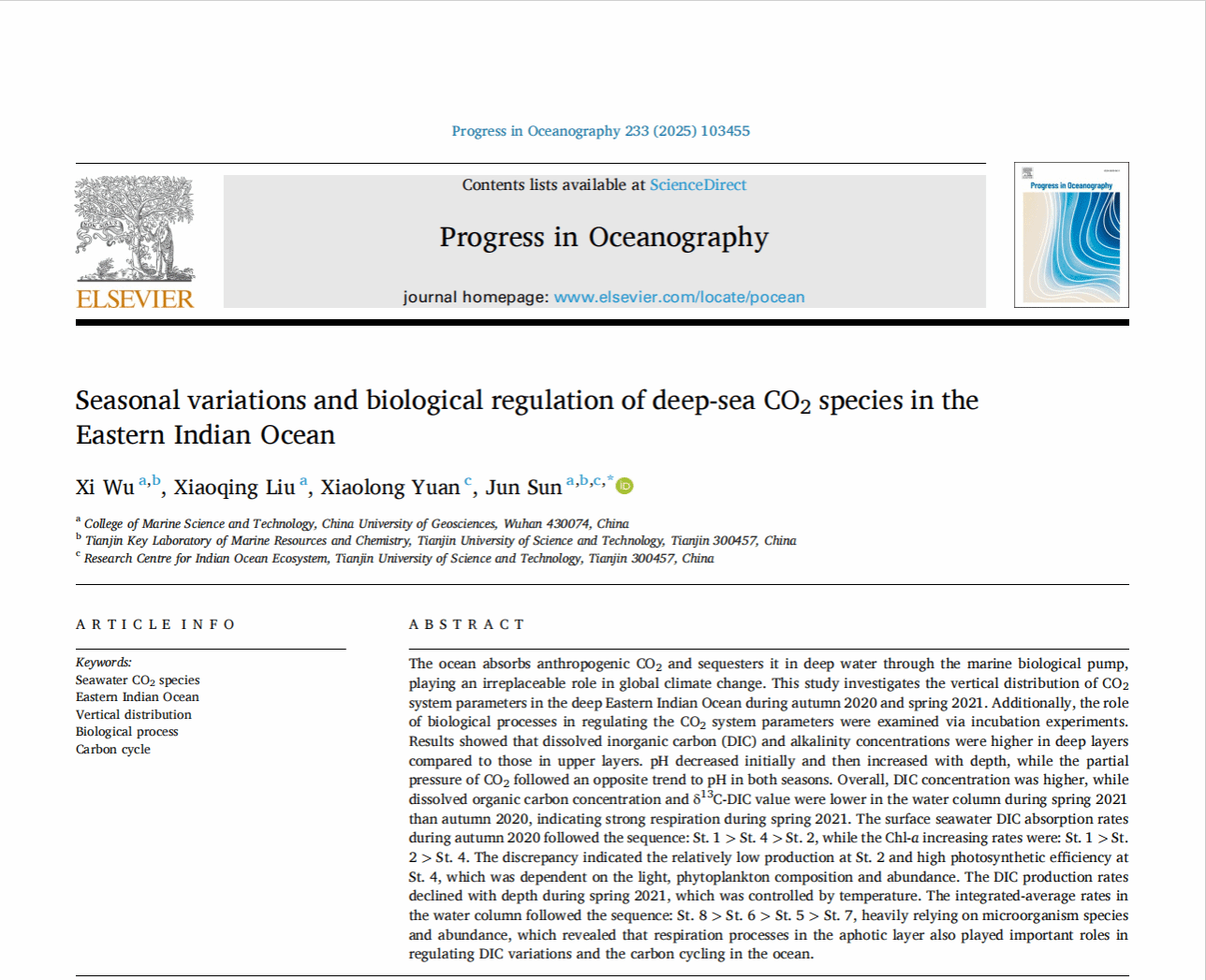2025年3月5日,海洋学国际期刊《Progress in Oceanography》以 “Seasonal variations and biological regulation of deep-sea CO2 species in the Eastern Indian Ocean” 为题在线发表了我院教师的研究成果。