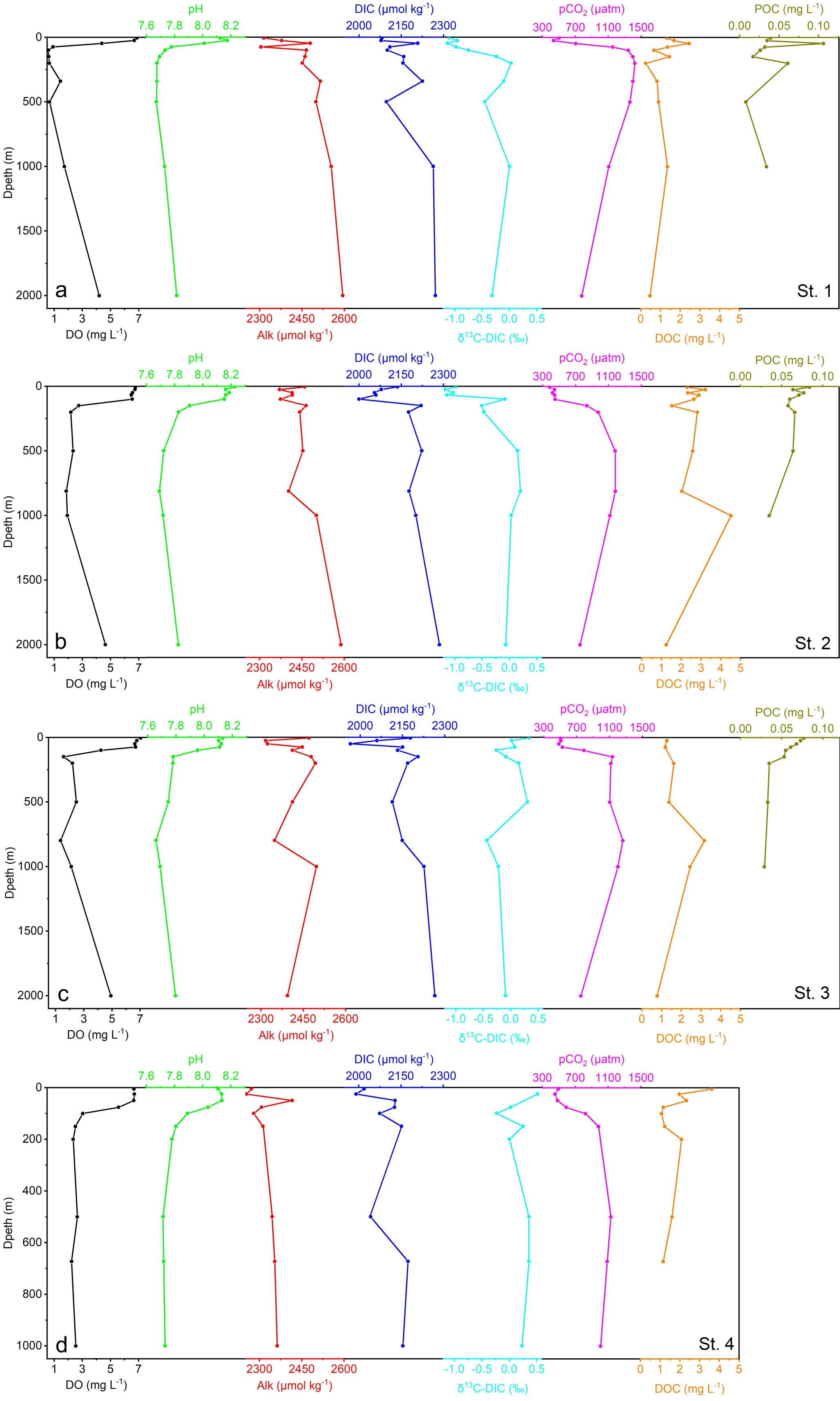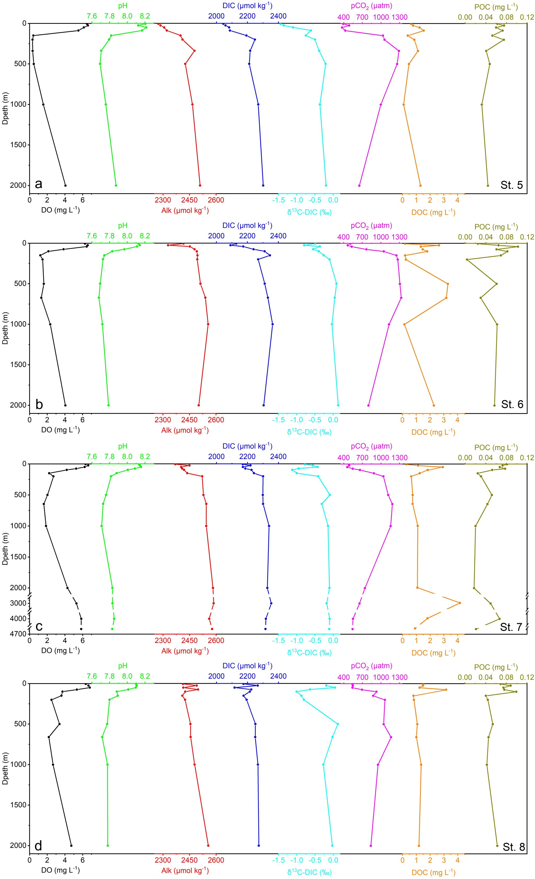 2021年春季的呼吸实验结果显示,DIC的产生速率随深度的增加而下降,这主要是由温度控制的。水柱积分的DIC生成速率大小依次为站位8>站位6>站位5>站位7,在很大程度上依赖于微生物的种类和丰度,这揭示了无光深水区的呼吸过程在调节 DIC 变化和海洋碳循环方面也发挥着重要作用。