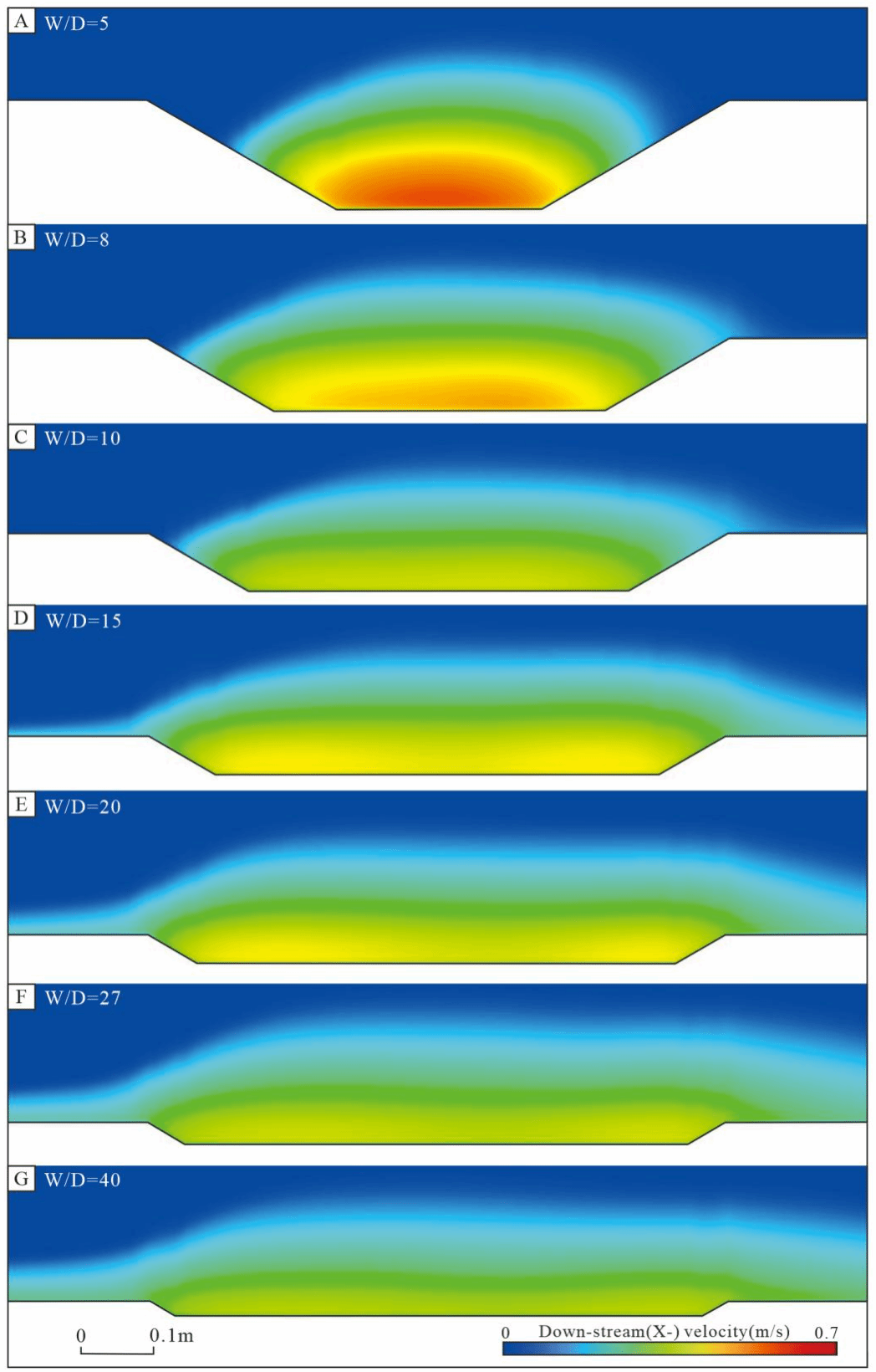 针对上述问题,研究基于对前人地震资料的分析和数值模拟手段,构建了一系列具有不同宽深比的水道模型,依托Fluent数值模拟平台,采用基于有限体积法的欧拉多相流模型,求解海水—沉积物颗粒的质量与动量守恒方程,系统分析重力流—底流交互背景下流体—沉积耦合行为。通过比较不同宽深比条件下水道内的流体结构特征,从流体动力学角度深入探讨重力流与底流共同控制下不同限制性水道的迁移机制。