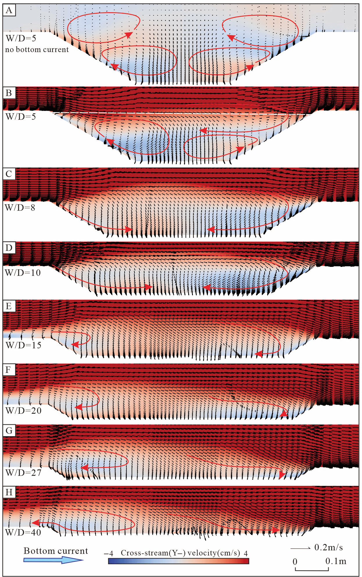 研究结果表明,水道限制性的变化调控着重力流与底流交互作用强度,进而改变水道内流速分布和二次流环流结构,最终影响近床底沉积物的动力学响应。随着宽深比增加,交互作用增强,水道内二次流位置由顺底流一侧移至逆底流一侧,相应地,近床底沉积物的优势输运方向亦由向底流上游偏移转变为向底流下游偏移。①对于极强限制性水道:底流影响主要位于水道上方,重力流则基本限制在水道内部,两者交互作用极弱。水道内流体行为与无底流时的重力流类似,受湍流各向异性主导的二次流控制,因此水道基本不发生侧向迁移。②对于中等限制性水道:此类水道具有较小宽深比,但底流已能对重力流产生显著影响。交互作用下在水道下游形成由底流重力流剪切压力差驱动的二次环流,将下游近床底沉积物输运至上游堆积,促使水道整体向下游迁移。③对于较弱限制性水道:宽深比较大,重力流底流交互作用较强。底流翻越水道壁后直接下沉,将沉积物输移至下游堆积,而上游形成的二次环流极弱。该机制导致水道倾向于向上游迁移。